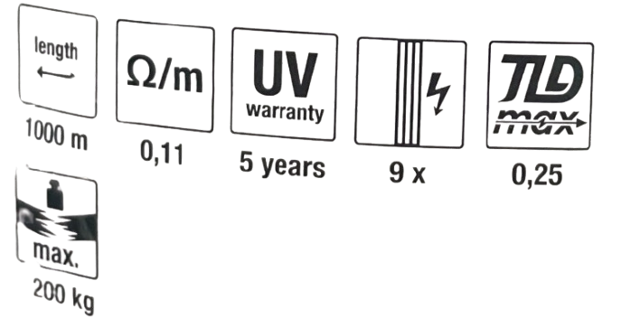 Balta / juoda spalva labiau kontrastuoja su aplinka ir yra geriau matoma tamsoje. Ši virvė ypač tinka ilgoms tvoroms su gausia augmenija.